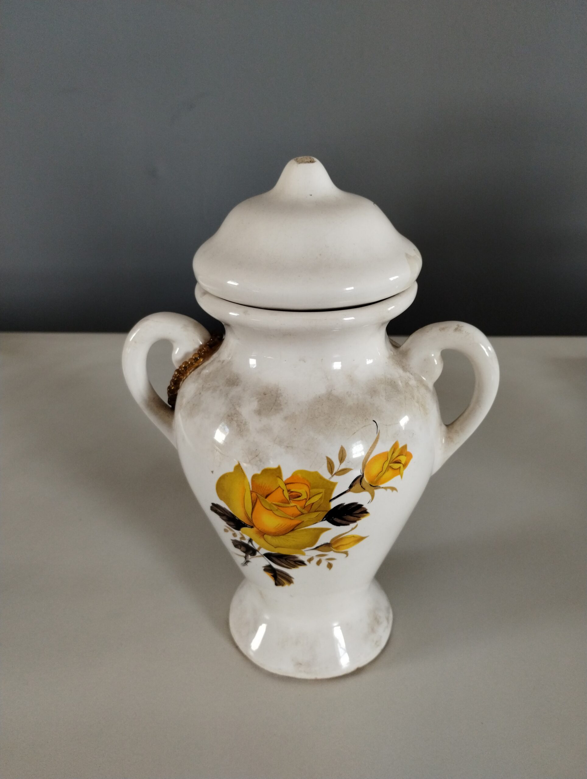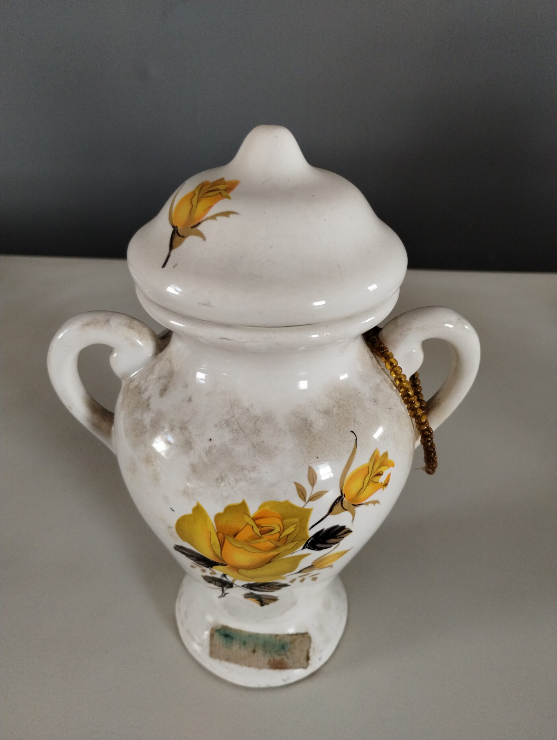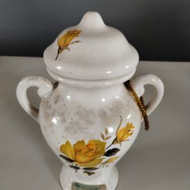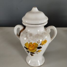 Ânfora (quartinha) na cor branca, com pintura de ramo de rosas amarelas na tampa e no corpo. Em uma das alças, um fio pequeno de miçangas douradas amarrado.