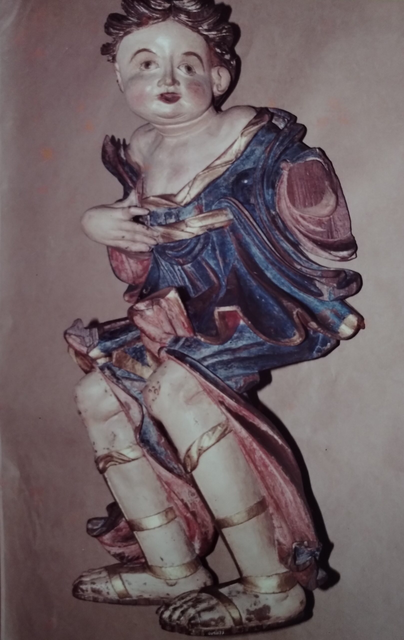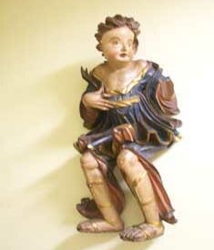 Imagem de anjo em madeira policromada com costas planas (de pendurar). Cabeça voltada à direita do observador. Cabelos curtos formados por mechas largas; faces salientes rosadas; lábios vermelhos; rosto ligeiramente contorcido (face deformada). Traja túnica curta azul com debrun dourado e fundo vermelho; ombros à mostra e sandálias douradas cruzadas nas pernas. Braço esquerdo mutilado e o direito flexionado junto ao peito, tendo o punho saliente e longos dedos. Pernas flexionadas voltadas à esquerda do observador, aparentando estar pousado.