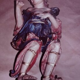 Informações tiradas de fichas anteriores: anjo em madeira colorida, talha do século XVIII, vindo de uma capela mor em Minas; doação do Conde Dejean, embaixador da França;