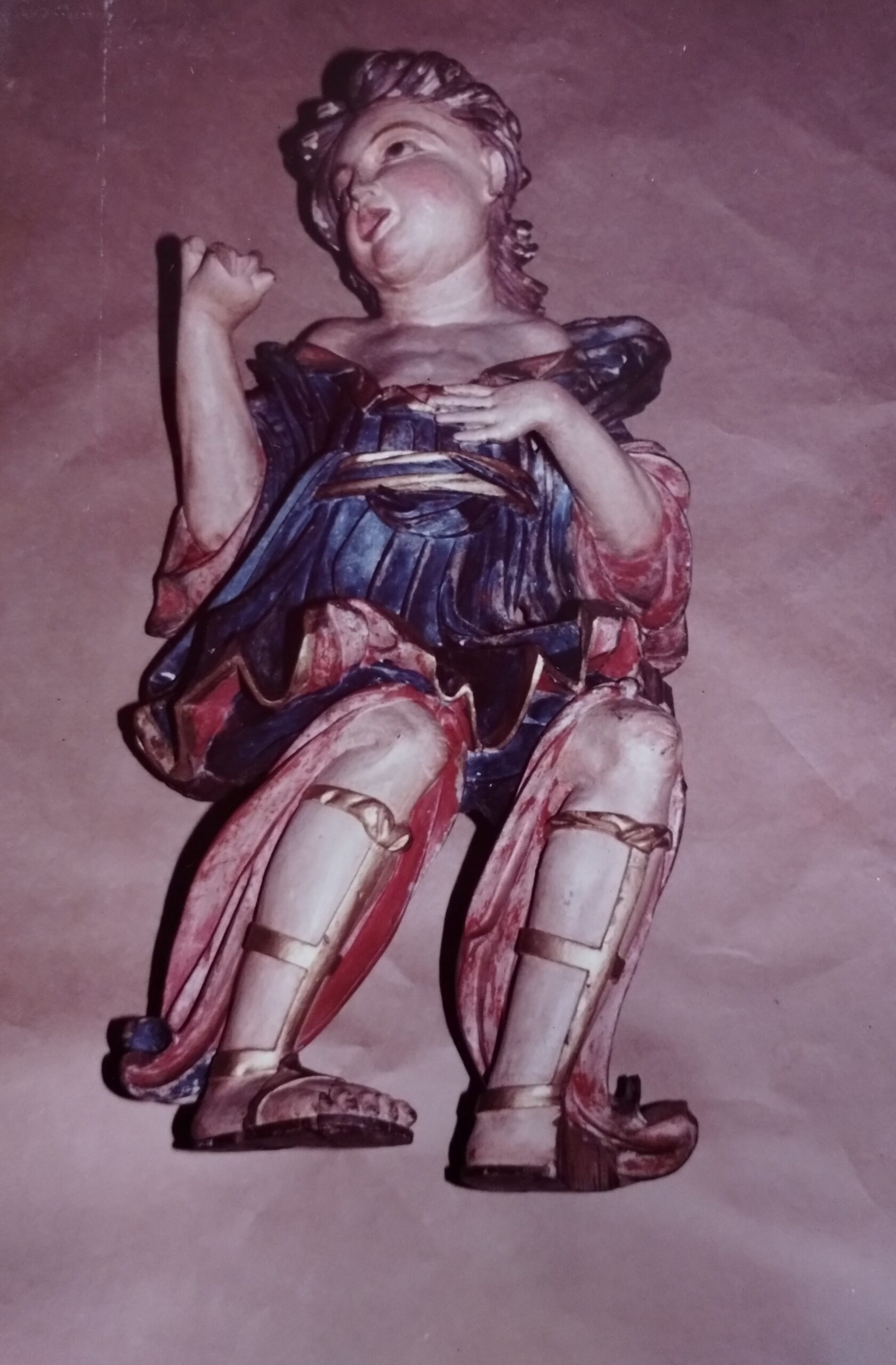 Imagem de anjo em madeira policromada com costas planas (de pendurar). Cabeça voltada à esquerda do observador. Cabelos curtos voltados para trás formados por mechas. Sobrancelhas arqueadas; faces salientes rosadas; boca entreaberta; rosto ligeiramente contorcido (face deformada). Traja túnica curta azul com debrun dourado e fundo vermelho; ombros à mostra e sandálias douradas cruzadas nas pernas. Braço esquerdo flexionado junto ao corpo com os dedos finos (desproporcional). Braço direito erguido com dedos quebrados. Pernas flexionadas voltadas à direita do observador, aparentando estar pousado.
