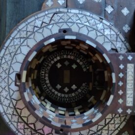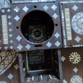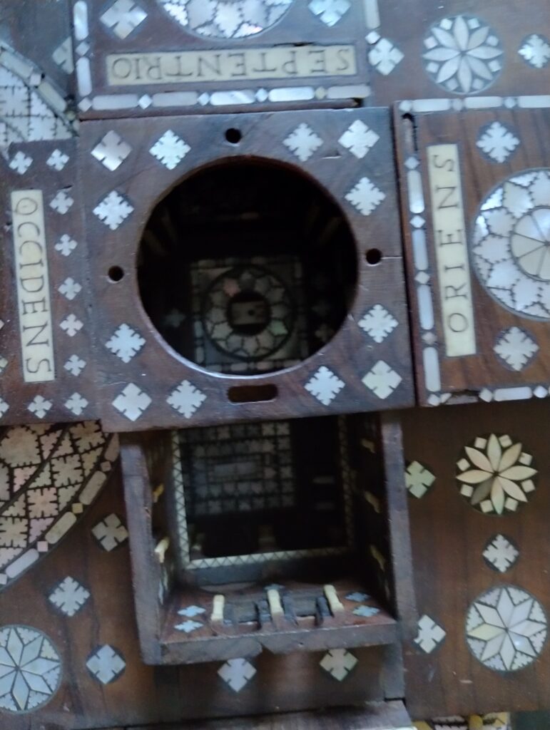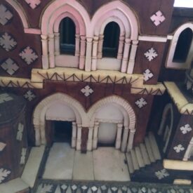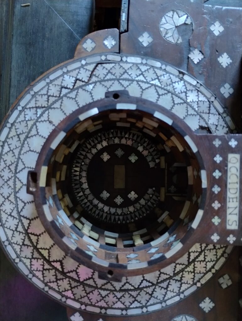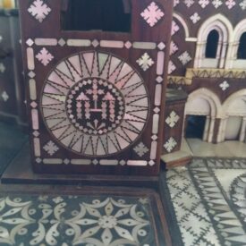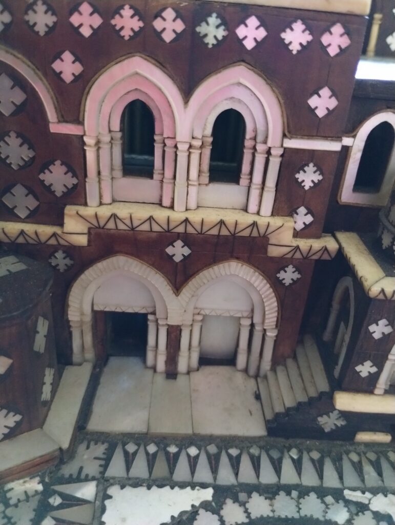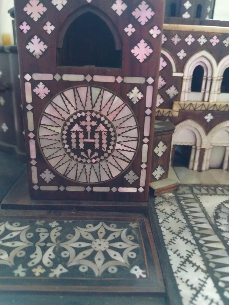 Modelo da igreja do Santo Sepulcro em cedro do Líbano todo marchetado de madrepérola. As incrustrações constituem séries de ornatos seguintes, às vezes concêntricos, com infinidade de pequenos quadrifólios, rosáceas e estrelas isoladas. No simulacro de adro, à frente da entrada principal, está desenhada a cruz do Santo Sepulcro em madrepérola. A ornamentação também está nas partes internas da peça, que podem ser vistas com a remoção de cúpulas, torre e e partes do telhado. Pequenas portas e janelas se abrem a toda volta. Em volta de uma das cúpulas, em marfim, estão as inscrições: "OCCIDENS/ORIENS/SEPTENTRIO"