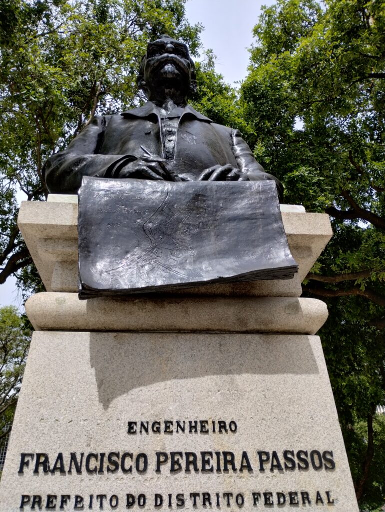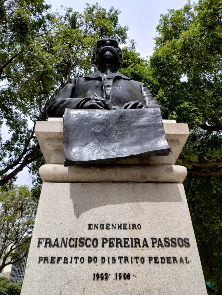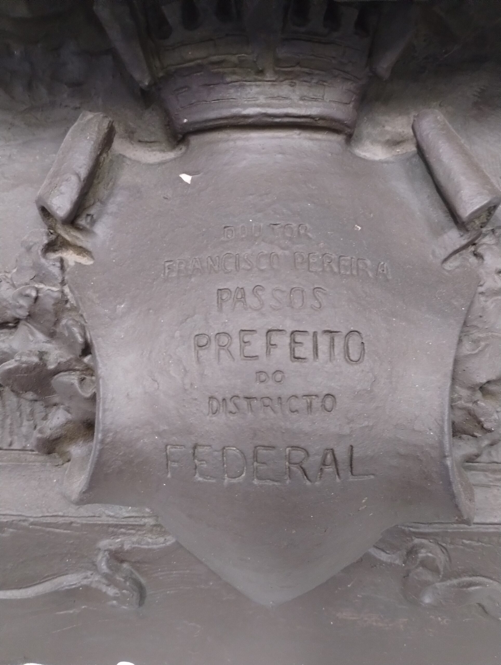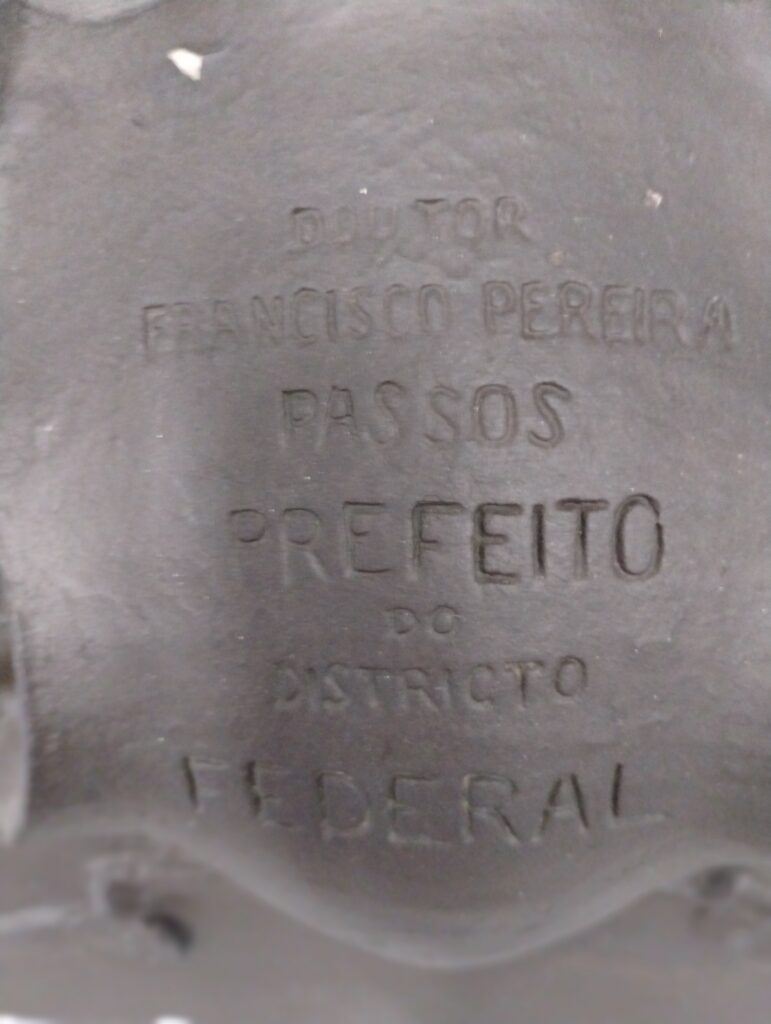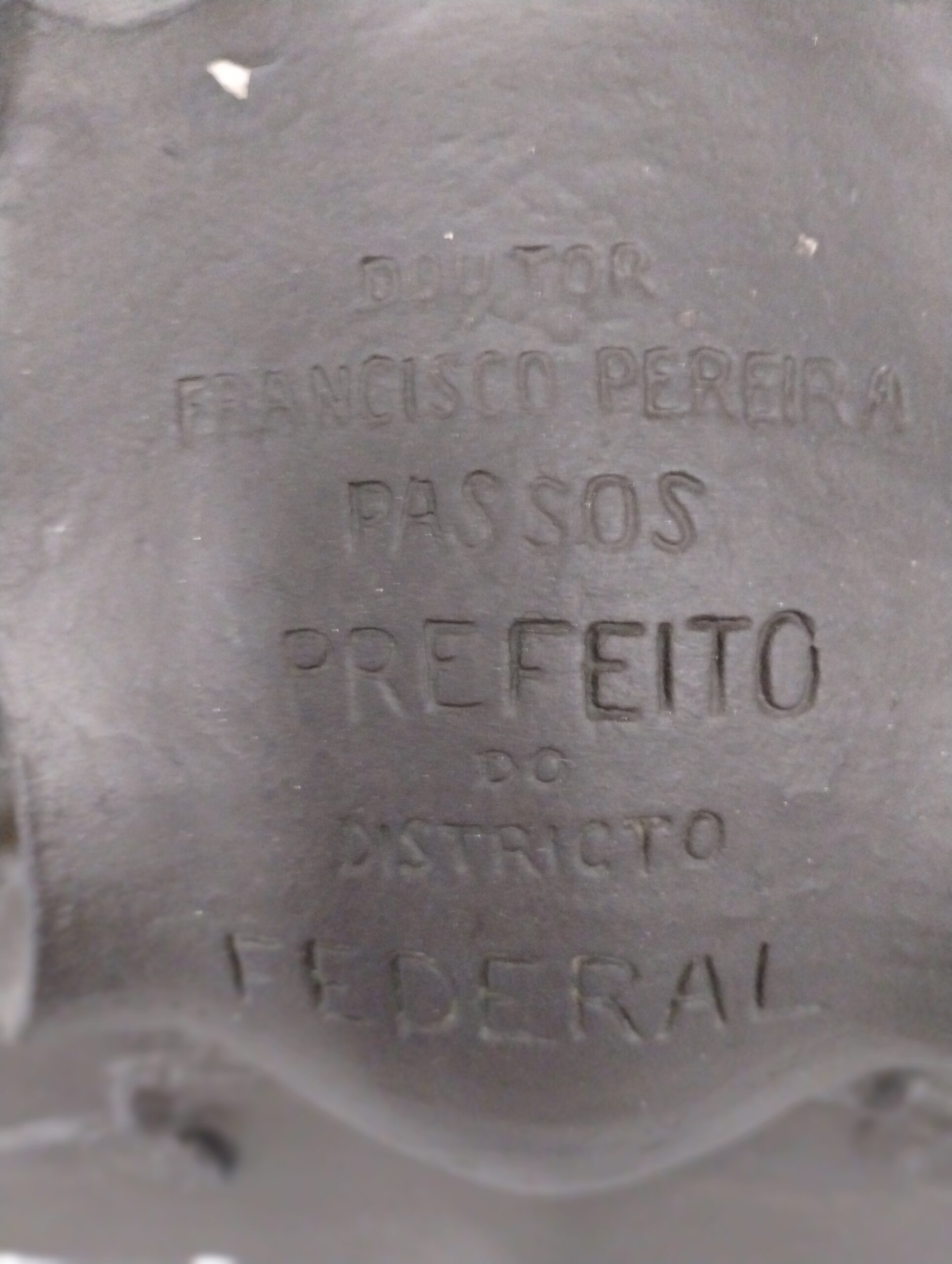 busto de figura masculina em trajes civis, tendo na parte inferior da base cartela com recortes enrolados e a inscrição doutor francisco pereira passos. prefeito do districto federal . assinado na parte inferior da peça: rod bernardelli / 1906 - rio