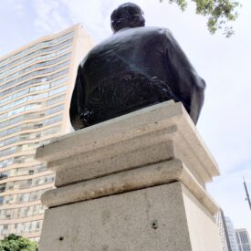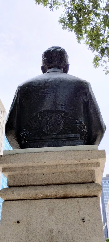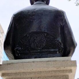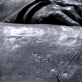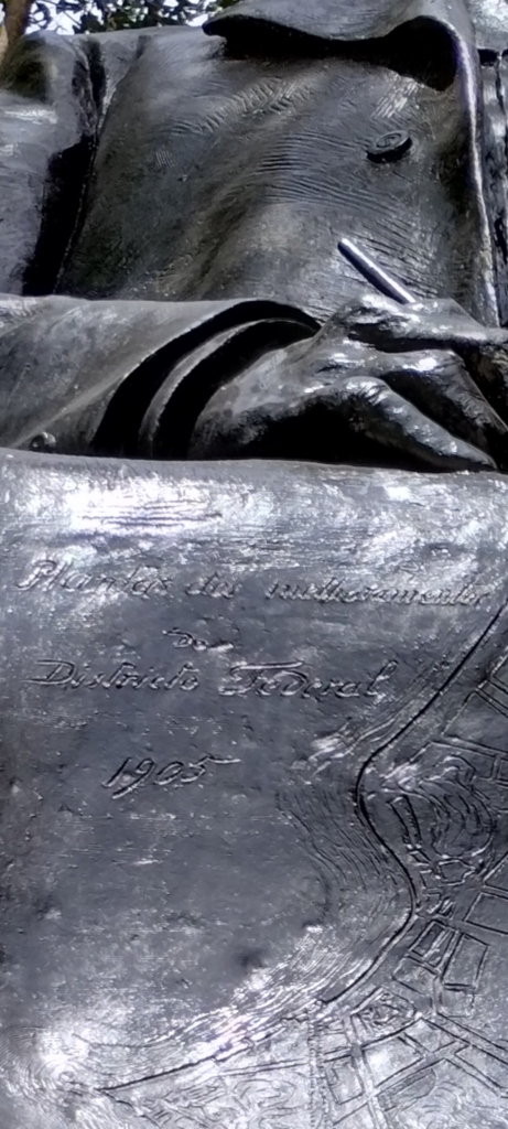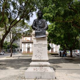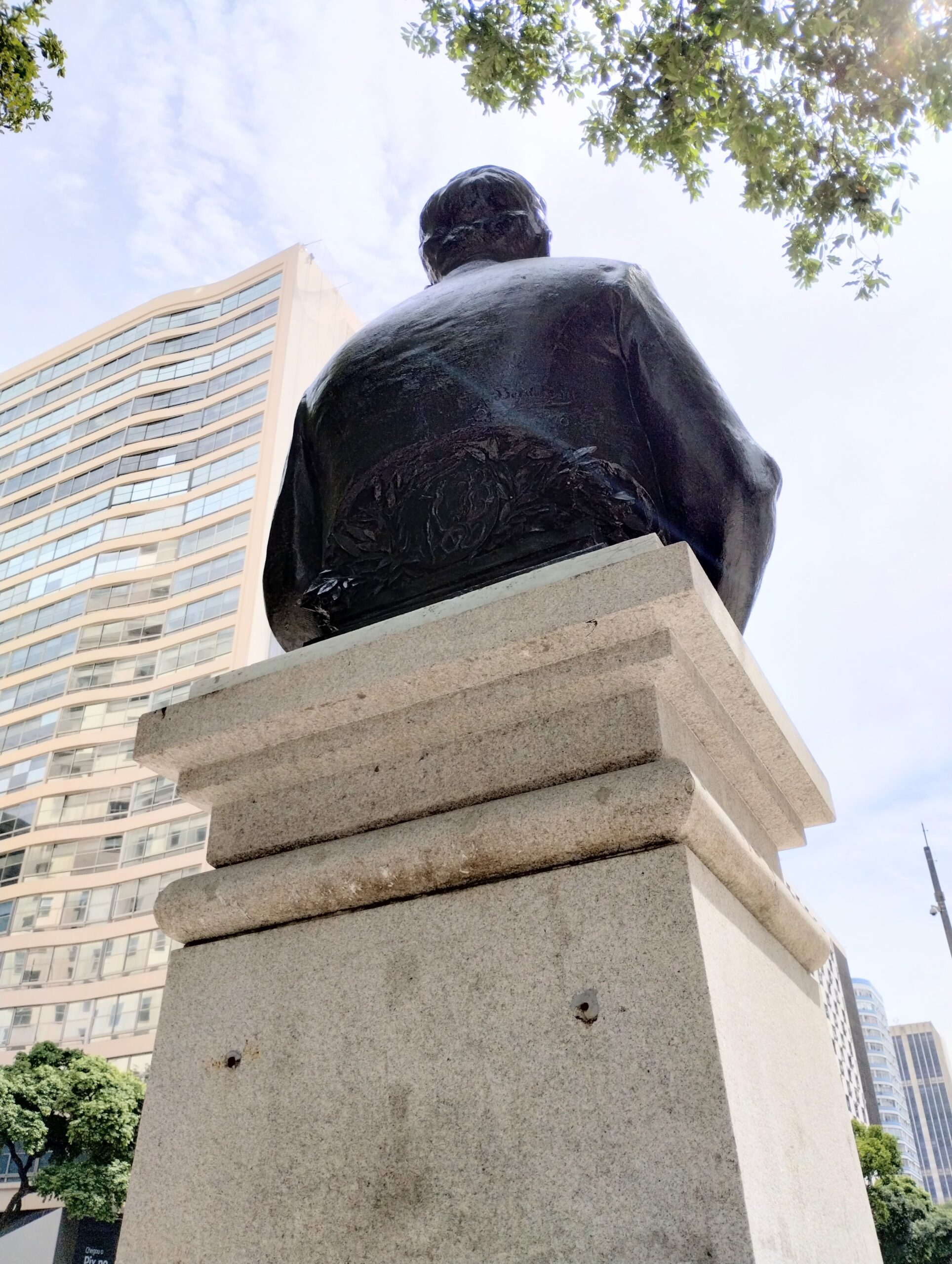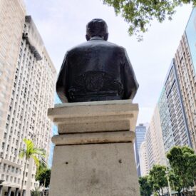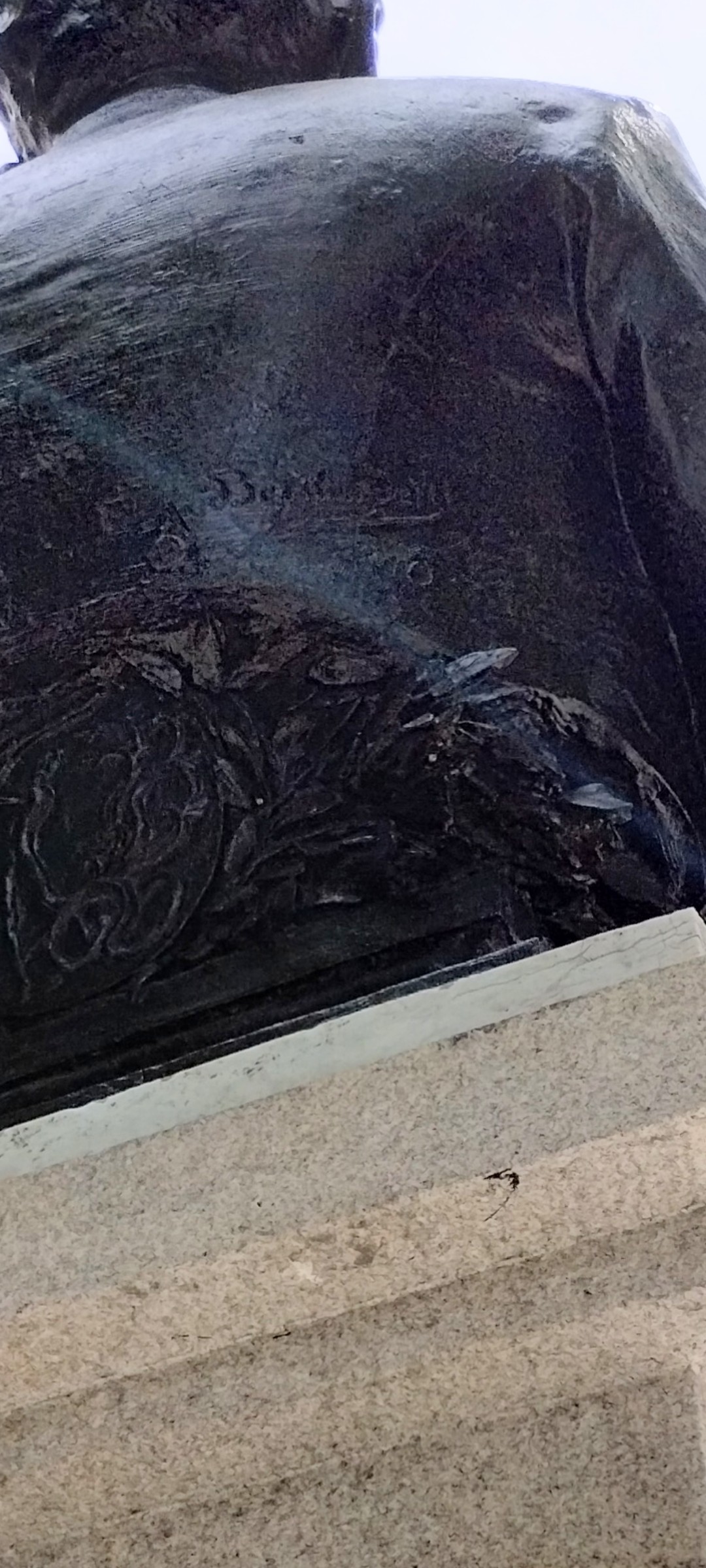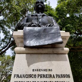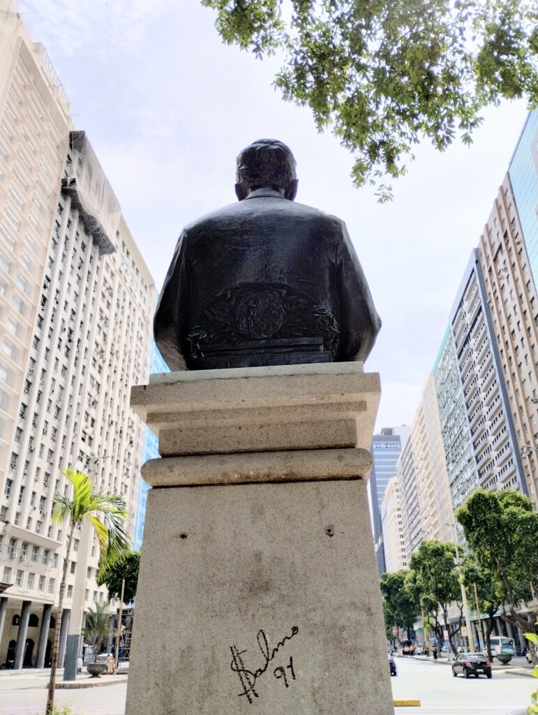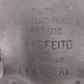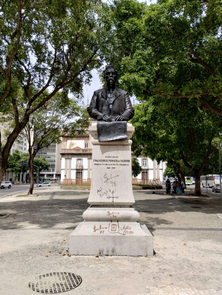 busto de figura masculina em trajes civis, tendo na parte inferior da base cartela com recortes enrolados e a inscrição doutor francisco pereira passos. prefeito do districto federal . assinado na parte inferior da peça: rod bernardelli / 1906 - rio
