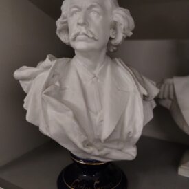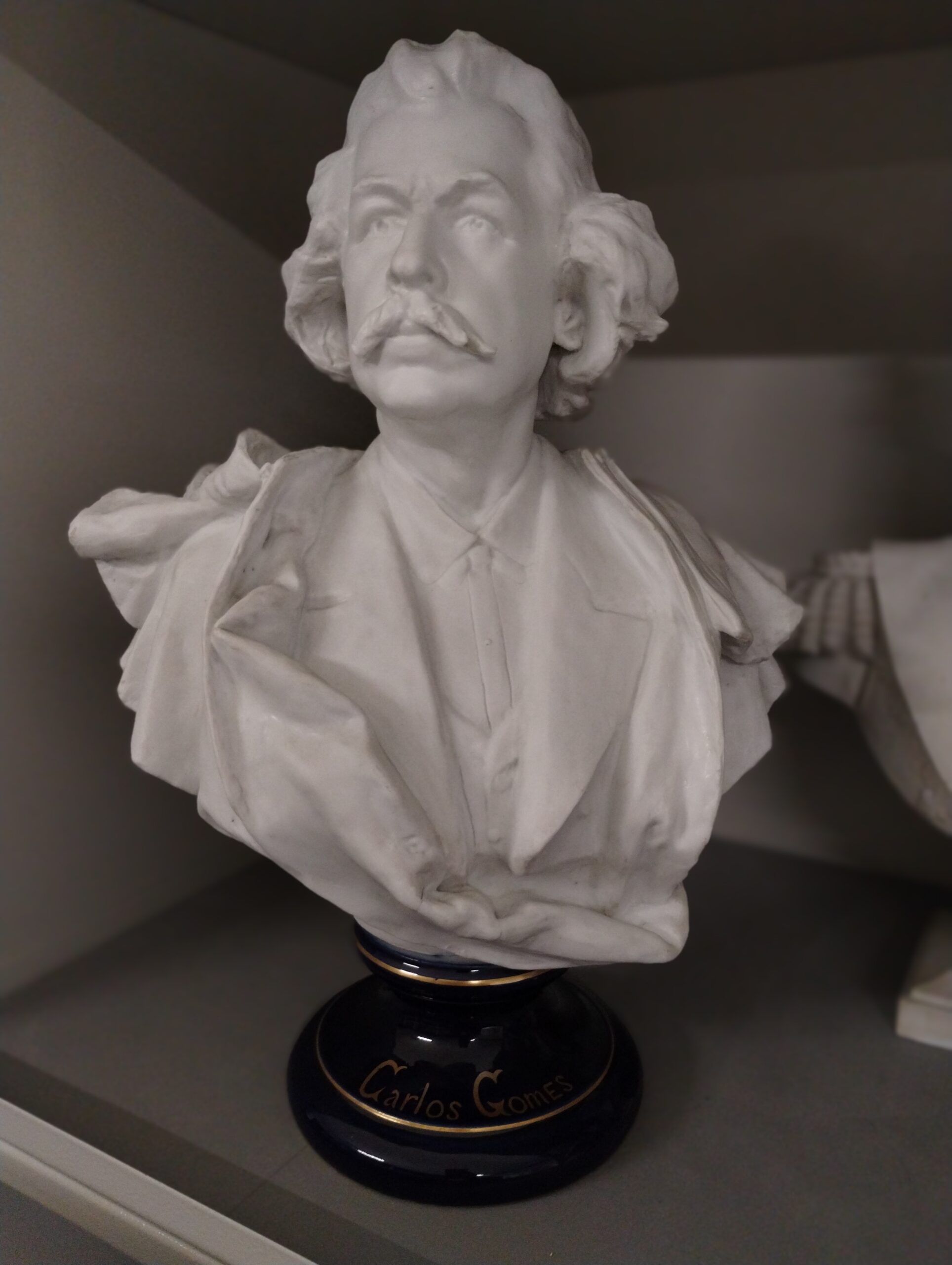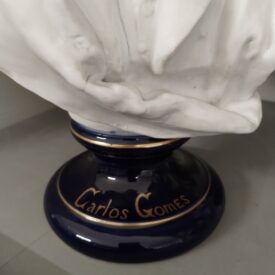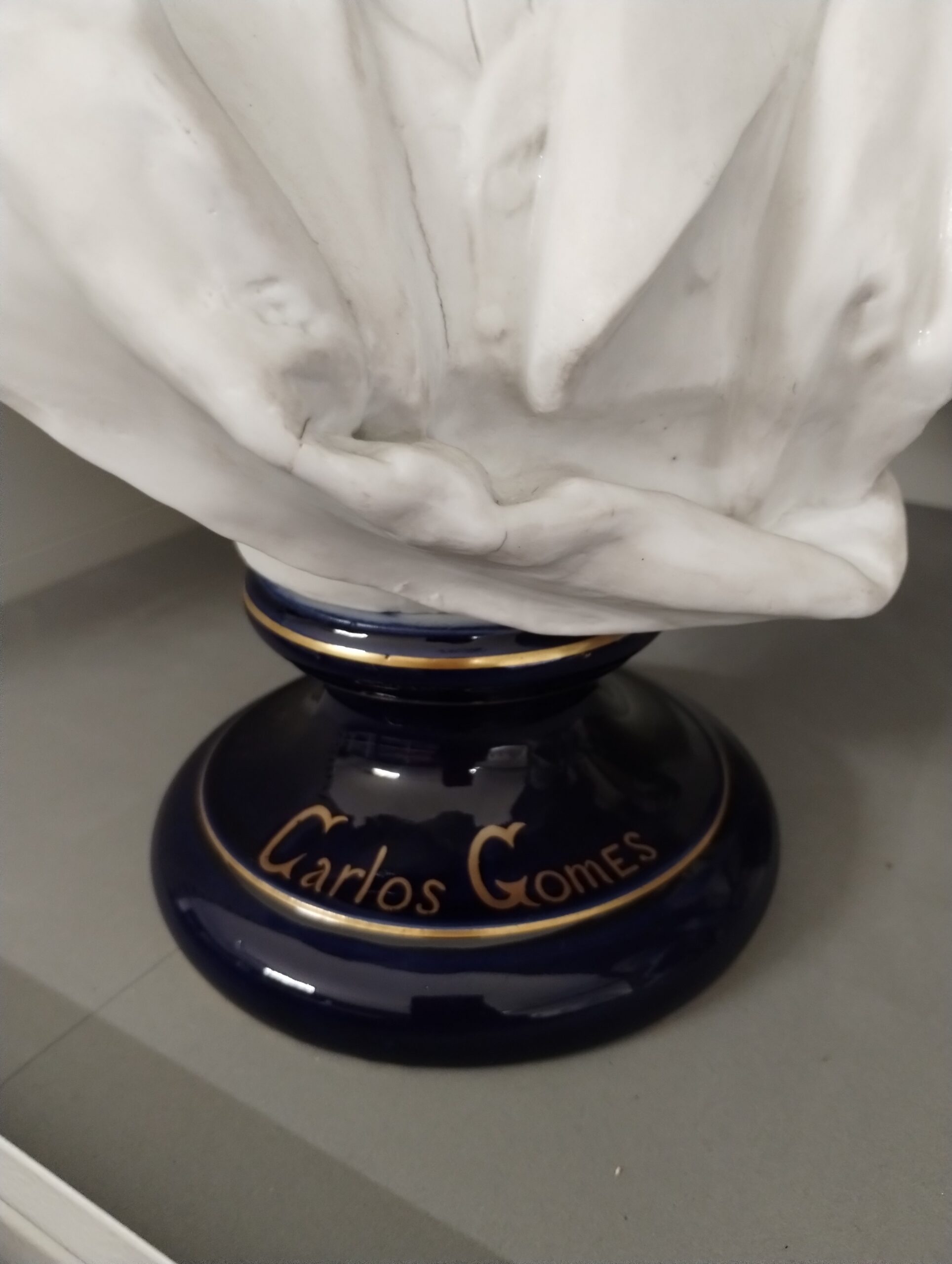 Busto em biscuit retratando figura masculina frontalizada, identificada como o Maestro Carlos Gomes, rosto voltado à direita sobre base circular em porcelana azul, tendo em dourado a inscrição: "Carlos Gomes". Cabelos volumosos, usa bigode. Traja paletó, colete, camisa e gravata em laço, sobre estes uma capa com gola larga com grande panejamento.