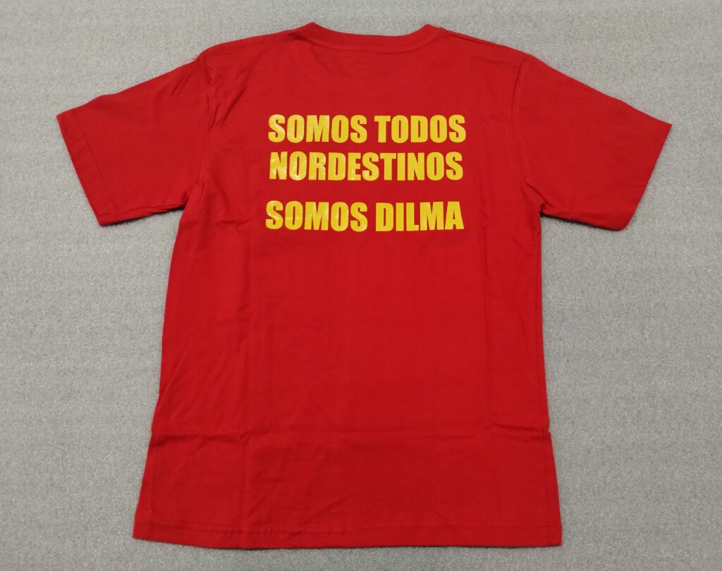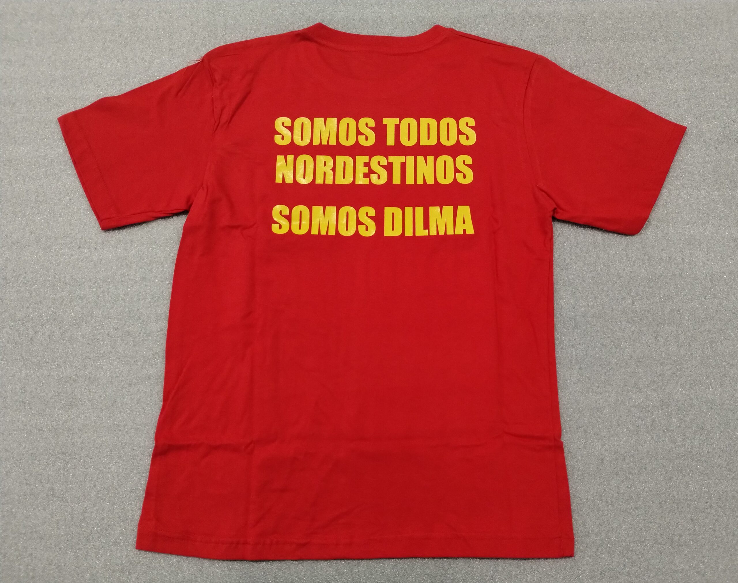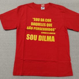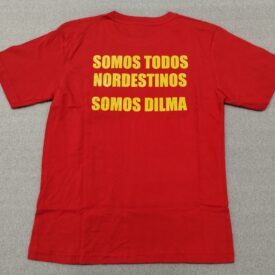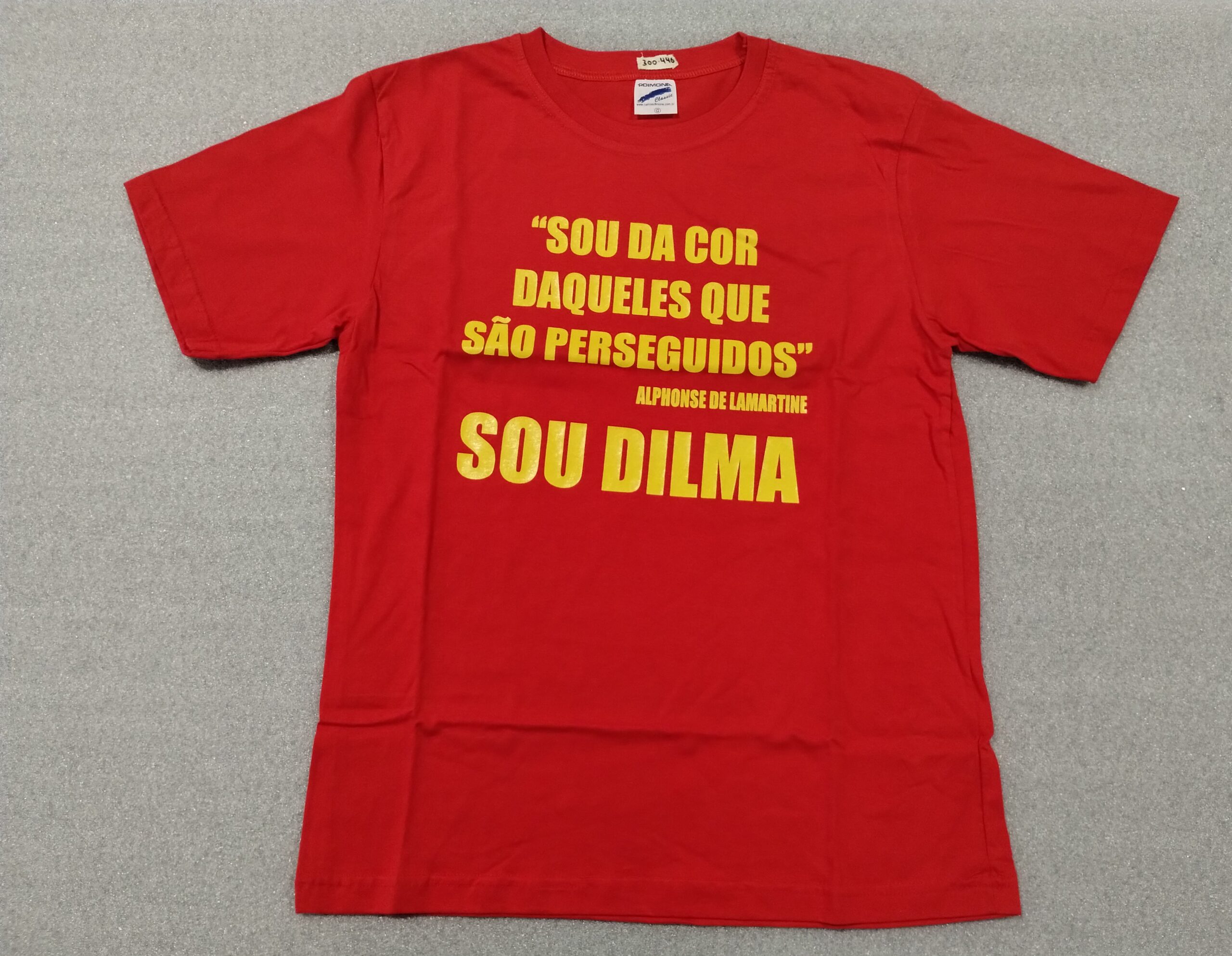 Camiseta de campanha política na cor vermelha, contendo as inscrições na frente: "Sou da cor daqueles que são perseguidos / Alphonse de Lamartine / Sou Dilma". No verso: "Somos todos nordestinos / somos Dilma". Produzida por Dimona Silk e Malhas Ltda. As inscrições em silk são na cor branca e a camiseta é de malha de algodão, com mangas curtas e gola redonda.