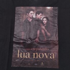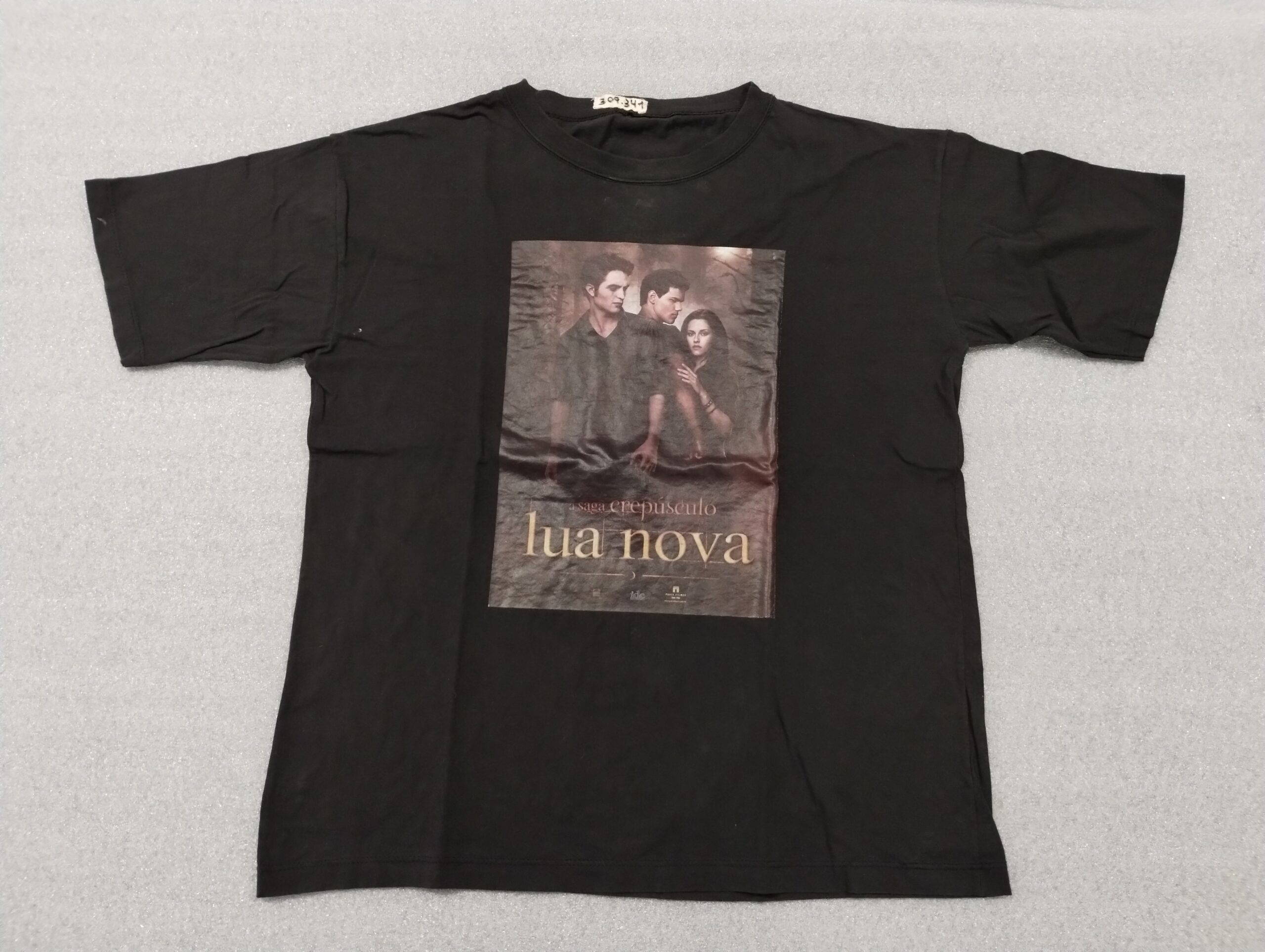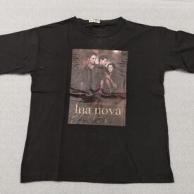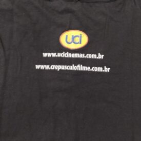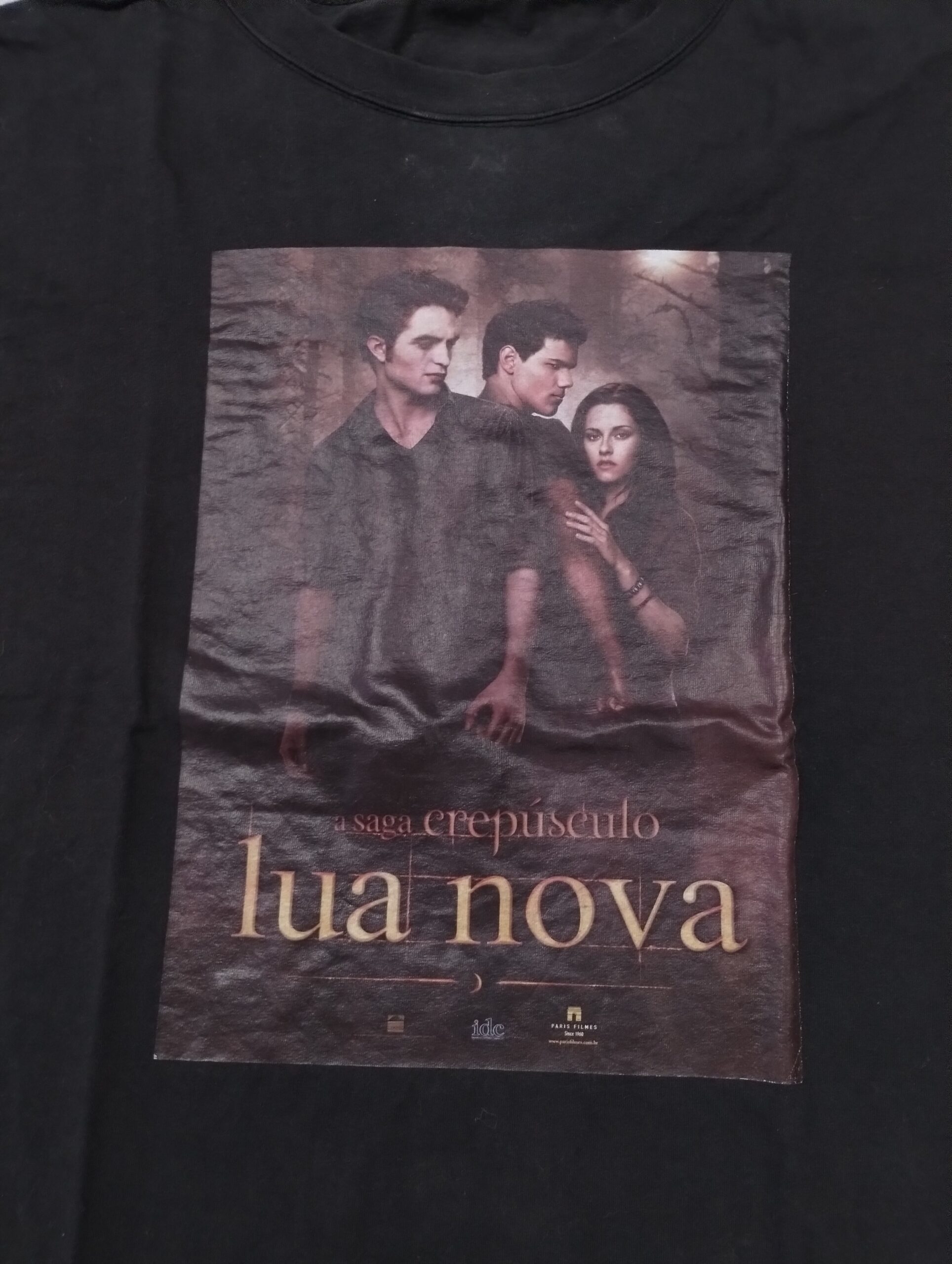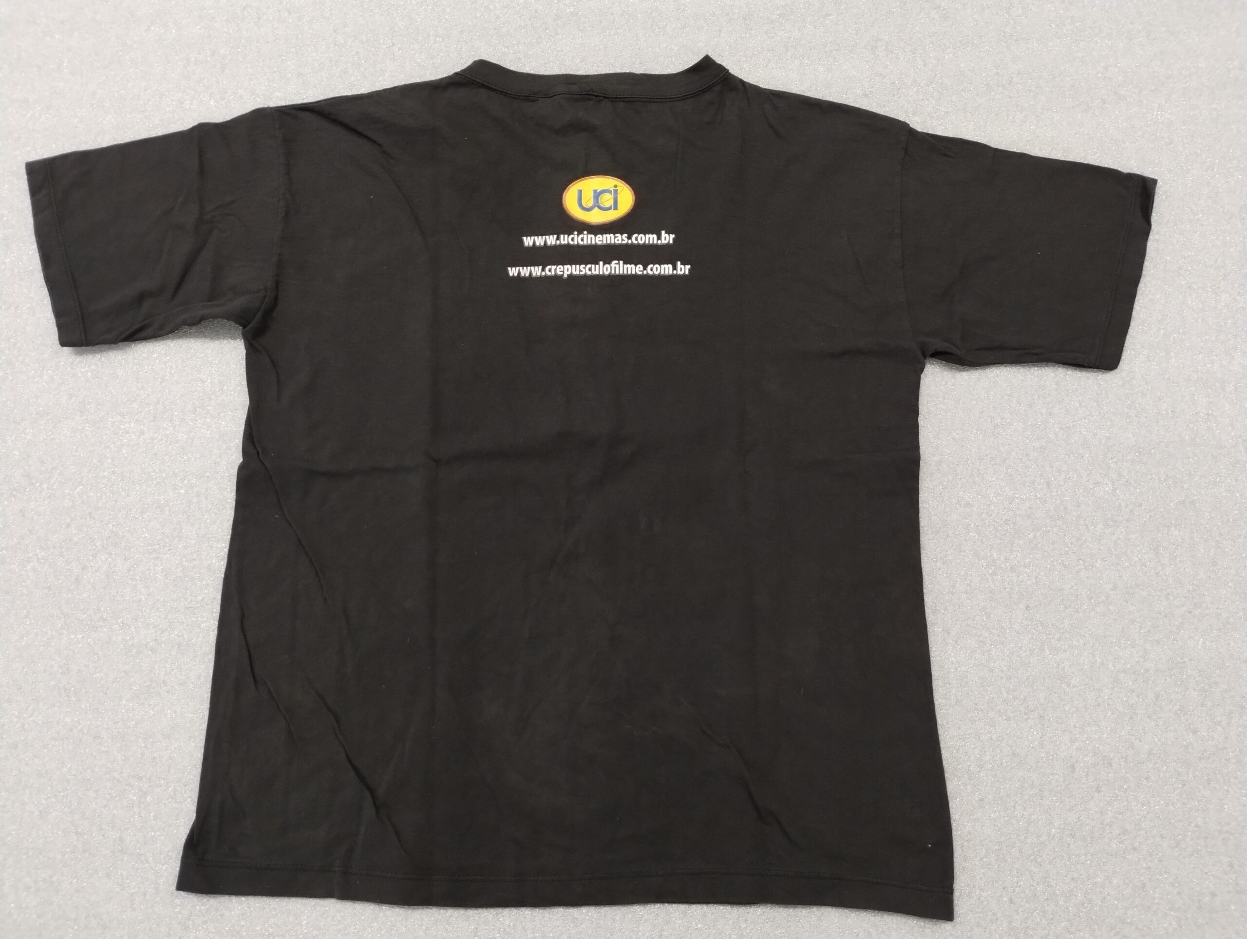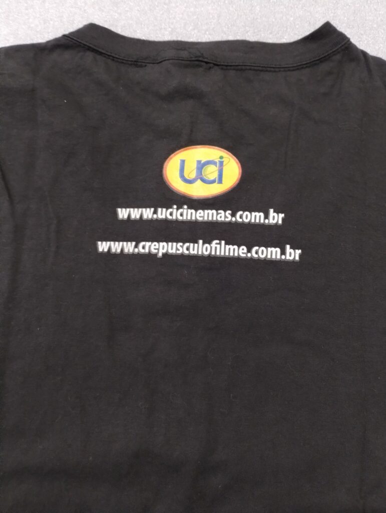 Camisa de algodão na cor preta com silk na parte da frente do filme "Lua Nova" da Saga Crepúsculo, constando imagem promocional dos três protagonistas. Na parte posterior, logomarca da rede de cinemas UCI centralizada, acompanhada dos endereços dos portais na internet "ucicinemas.com.br" e "crepusculofilme.com.br". Peça utilizada no traje da tática Black Block durante as manifestações sociais de junho de 2013.