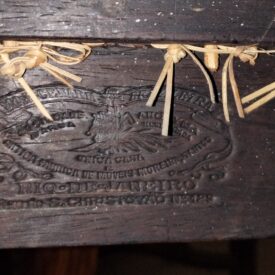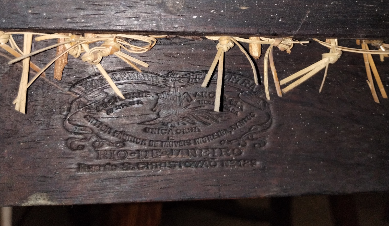 Espaldar formado por dez traves verticais, retilíneas, presas a parte traseira do assento e rematadas no topo por grande trave horizontal, sinuosas com demarcação de três lugares, decorada com trifólios em talha vazada, volutas e motivos fitoformos em talha cheia nas extremidades. A união das traves verticais com a horizontal, resulta na formação de nove arcos vazados, sendo que os três centrais são trilobados. Braços: partem do espaldar, com incisões em linhas nas partes laterais e superiores, ligeiramente abertos, com apoio para o braço retilíneo e terminam com volutas voltadas para baixo, motivos fitoformos em talha cheia, apoiados sobre o suporte para o braço, que apresenta incisões em linhas nas partes laterais e dianteiras. Assento com revestimento central em couro lavrado, prensado, incisado, decorado com volutas e torcidos nas extremidades, preso ao enquadramento de madeira por pequenas tachas de metal. O enquadramento apresenta em toda a borda, decoração em torcidos. Cintura dianteira, recortada na parte inferior en pequenas semi-circunferências. Pernas dianteiras e traseiras, torneadas, decoradas com discos, bolachas, cilindros, torcidos, terminando com os pés em discos. Interligando as pernas: três traves em forma de "H" decoradas com torcidos, sendo que as laterais são Intercaladas por cubos e a central por bola alongada e discos. Na parte inferior marcação do fabricante "MARCENARIA BRASILEIRA / SOCIEDADE ANÔNIMA / MARCA REGISTRADA / ÚNICA CASA / ANTIGA FÁBRICA DE MÓVEIS MOREIRA, SANTOS / RIO DE JANEIRO / Rua de S. CHRISTOVÃO Nº 123"