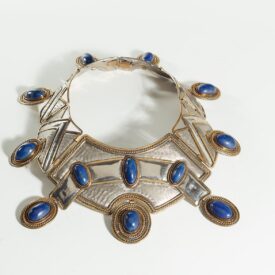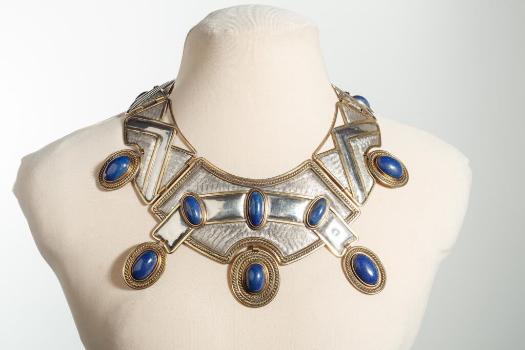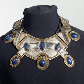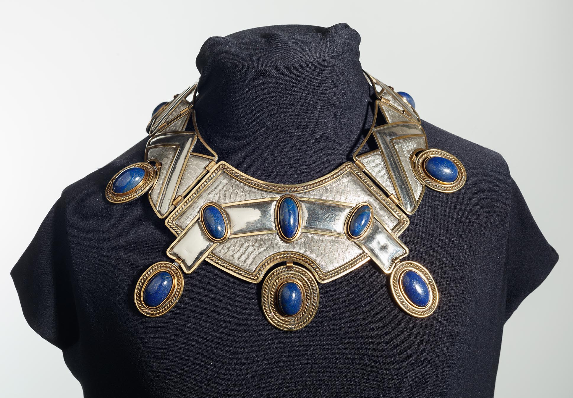 O colar é uma larga gargantilha rígida de prata, metal amarelo (possivelmente latão) e doze cabochões ovais de lápis-lazúli. Sua forma ovalada segue linha decrescente do centro no colo à nuca. É formado por sete placas chatas levemente abauladas, repuxadas, articuladas entre si por sistema de charneiras (feita com chapa de latão) (H9mm x L7mm) e eixo (o mesmo fio retangular de latão, que contorna cada módulo). O centro do colar é o maior componente da peça. Uma faixa, contornada por fio retangular de latão de 2mm de espessura, que sugere uma fita lisa e brilhante, transpassa a superfície. Nesta, há três cabochões ovais de lápis-lazúli (visto de frente, da esquerda para a direita: H23mmx L11mm; H23mmx L11,5mm e H21mmx L10mm), cravados à inglesa (com as virolas também em latão, com 1mm de altura e largura). Outros três cabochões, aplicados sobre medalhões pingentes, articulados no contorno externo do centro do colar, estão decorados com fios liso e torcido. Embora a gema do pingente central seja a menor (H22mmx L14mm), sua moldura (9mm de largura), decorada com duas fileiras de fios torcidos e lisos intercalados, lhe dá destaque. De cada lado do centro do colar, vem sequência em tamanho decrescente de três placas, finalizadas por fecho tipo palheta (H22mm x L11mm). Ao centro do contorno externo de todas as placas da gargantilha, há recuo circular que contorna os medalhões (H34mm x L25mm), as gemas têm as seguintes dimensões; à esquerda, do fecho para o centro: H25mmx L11mm; H25mmx L9mm e H27mmx L12mm; à direita, do fecho para o centro: H24mmx L14mm; H23mmx L14mm e H24mmx L16mm; espessura das gemas 9mm), e recebe a articulação, em rasgos e aros retangulares (H10mm x L3mm), com os pingentes. Nas placas laterais, formas triangulares compõem desenho geométrico, que nos sugere uma sequência de montanhas estilizadas (referência aos Andes?). O efeito da composição é destacado pelo contraste entre as áreas cheias e as vazadas, textura em hachuras (feita com ferramenta em movimento constante, uma fresa, por exemplo), áreas lisas polidas, a cor branca e a amarela dos metais, e o azul das gemas.