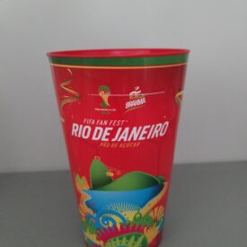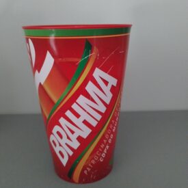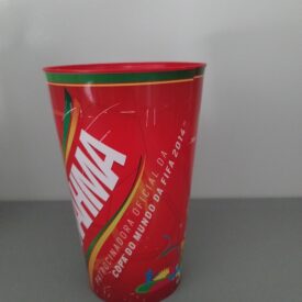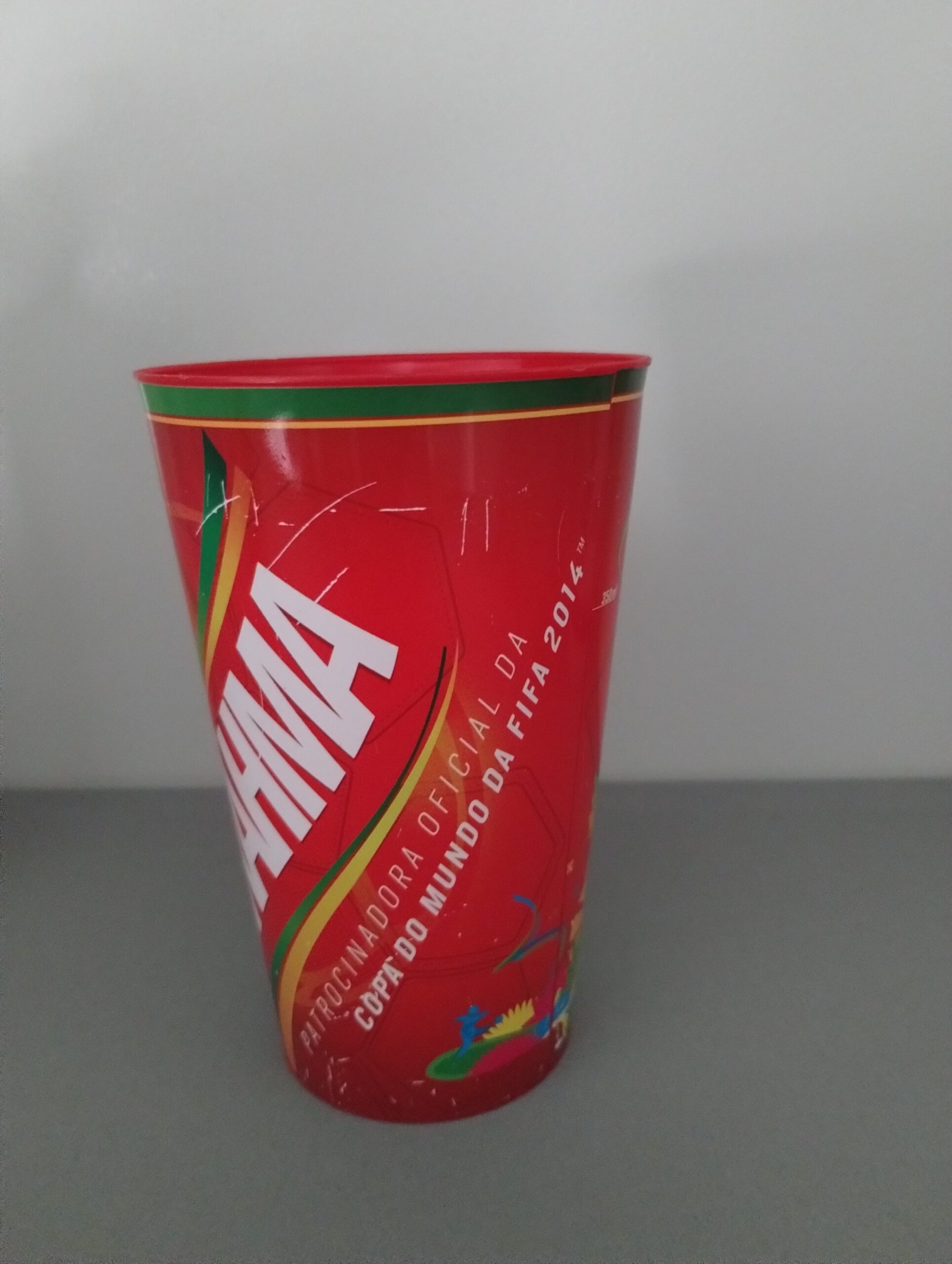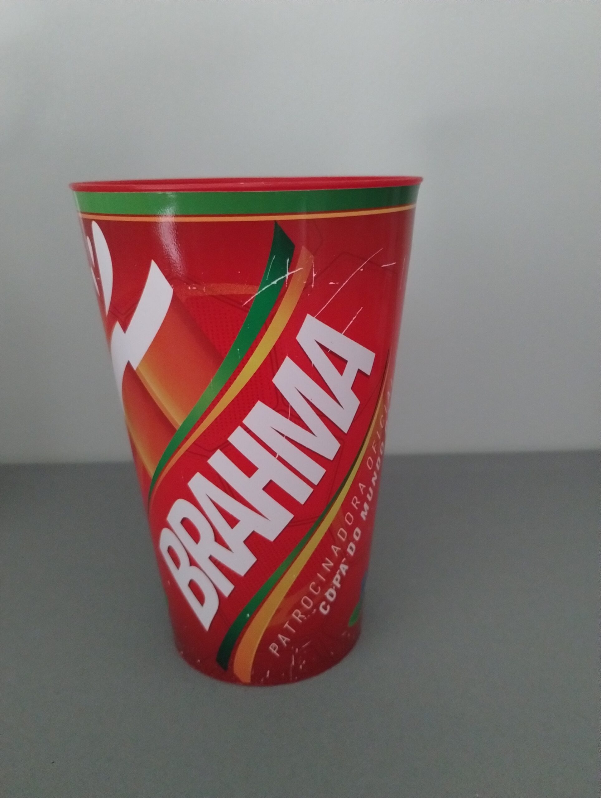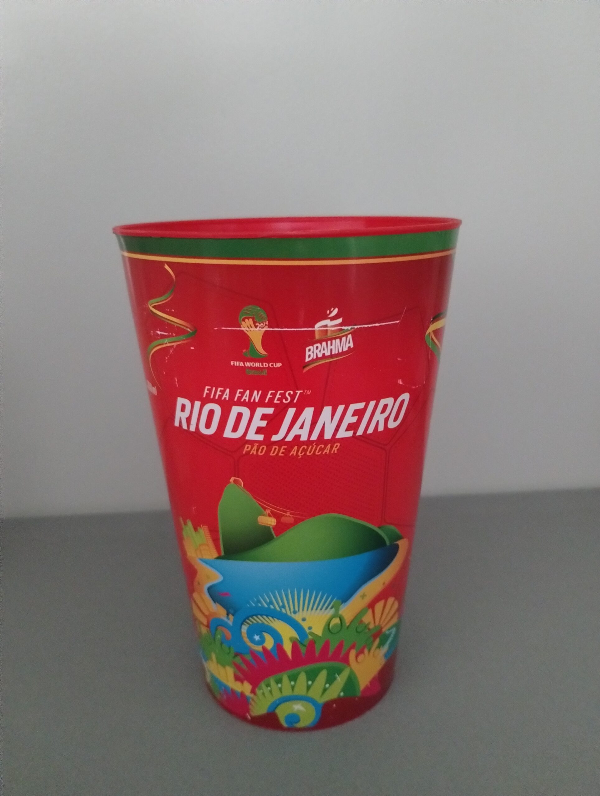copo plástico da fifa fan fest. o copo é revestido por papel adesivo no exterior. corpo do copo na cor vermelha; adesivo colorido, de cor predominante vermelha. o adesivo apresenta desenho estilizado do pão de açúcar e o nome da cervejaria brahma, patrocinadora do evento. inscrições: brahma - patrocinadora oficial da copa do mundo da fifa 2014 / 350 ml / fifa fan fest / rio de janeiro - pão de açúcar. observações: o adesivo apresenta diversas abrasões que deixaram o copo com vários arranhões e riscos brancos. diâmetro: 9 cm.