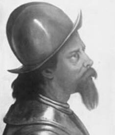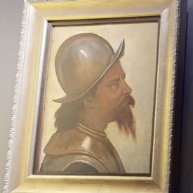 Busto de homem de perfil à direita. Rosto fino e magro. Morrião prateado. Cabelos escuros e lisos sobre a nuca. Sobrancelha curta e rala. Olhos claros. Espesso bigode e barbicha castanhos. Peitoral metálico. Fundo ocre esverdeado. Moldura em baguete de madeira escura, lisa, envernizada.