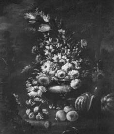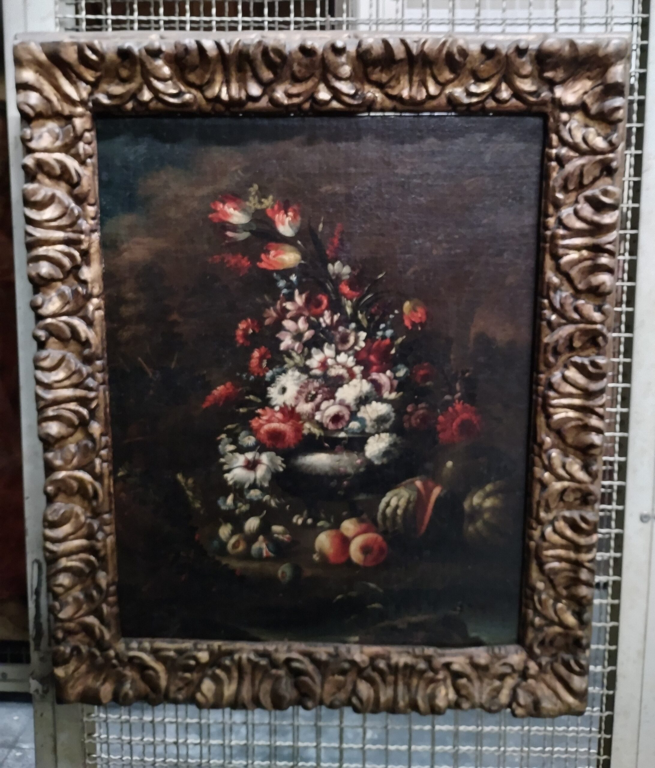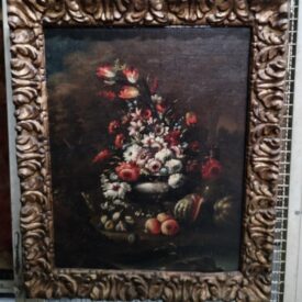 No primeiro plano, detalhe de água entre as pedras e no canto inferior esquerdo, espécie de vaso comprido, com tampa, na cor marrom-escuro, envolto por guirlanda de folhas. No centro, vários frutos, entre os quais, figos e romãs, e jarra larga e baixa, repleta de diversos tipos de flores. Fundo escuro, com sugestão de árvores e céu. Moldura em madeira estucada, dourada, recoberta de folhagens estilizadas.