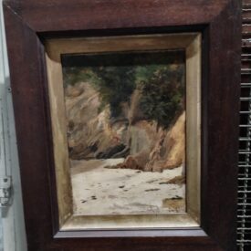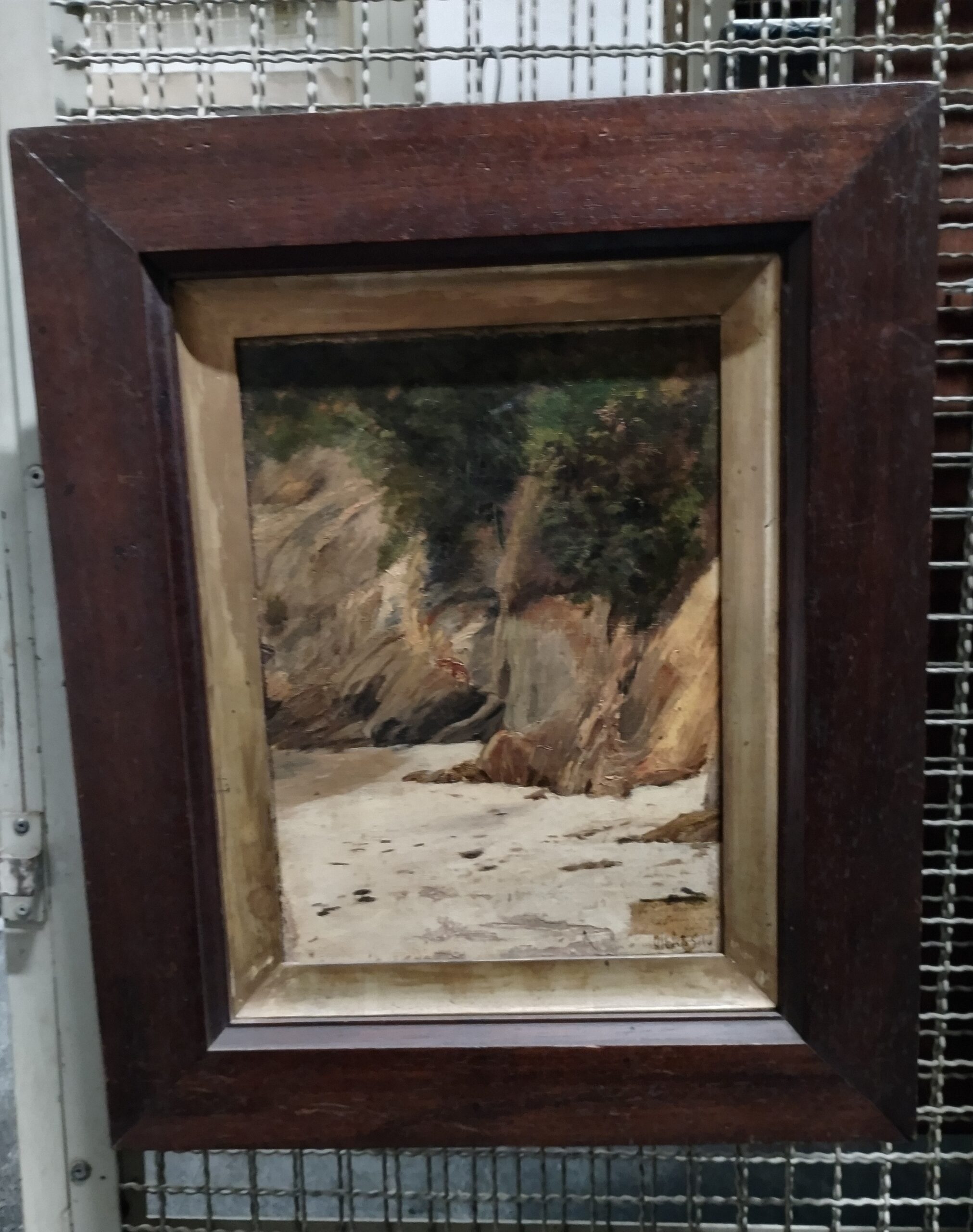 No primeiro plano, areal e, ao fundo, pedras em tons ocres, terrosos e cinzentos, recobertas de vegetação na parte superior. No canto inferior direito, a dedicatória: "Ao Coelho Netto/fraternamen. . . /offe. e. /Alberto Silv/97 (?). Assinatura do autor no canto inferior direito em tinta preta: "Alberto Silv/97 (?). Moldura em madeira lisa, escura, envernizada, baguete dourada.