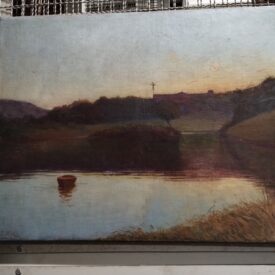Em primeiro plano, riacho em tons azuis e amarelados nas bordas, com pequena embarcação localizada no quadrante inferior esquerdo. Em segundo plano, vegetações na parte central, de uma extremidade a outra. Ao fundo, edificação e céu em tons azuis e amarelados. Assinatura do autor no canto inferior esquerdo, ilegível.
