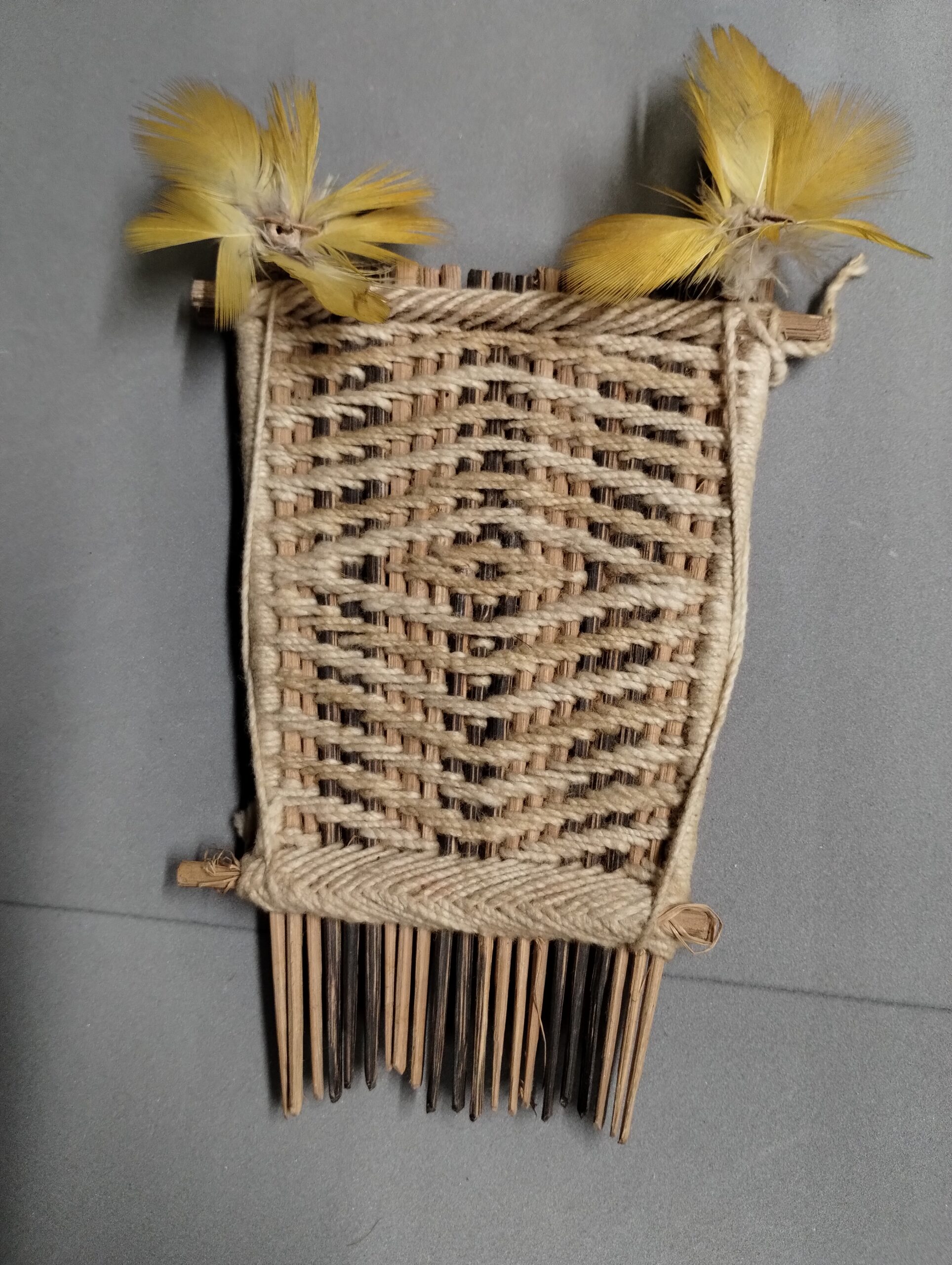 Pente (Zihó) retangular de lascas finas e afiladas de haste de palmeira, colocadas uma sobre a outra a 1/3 de altura a contar da ponta dos dentes. Essas lascas são revestidas de um trançado de fios de algodão ostentando desenhos losangulares ; de cada lado sobressaem duas lascas, um pouco acima da borda superior decoradas com rosetas de plumas amarelas e brancas ; na parte superior corre o fio de sustentação ; do lado externo dessas lascas laterais observam-se vários fios estirados, de modo a se cruzarem entre os dois pauzinhos transversais.