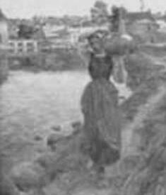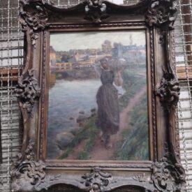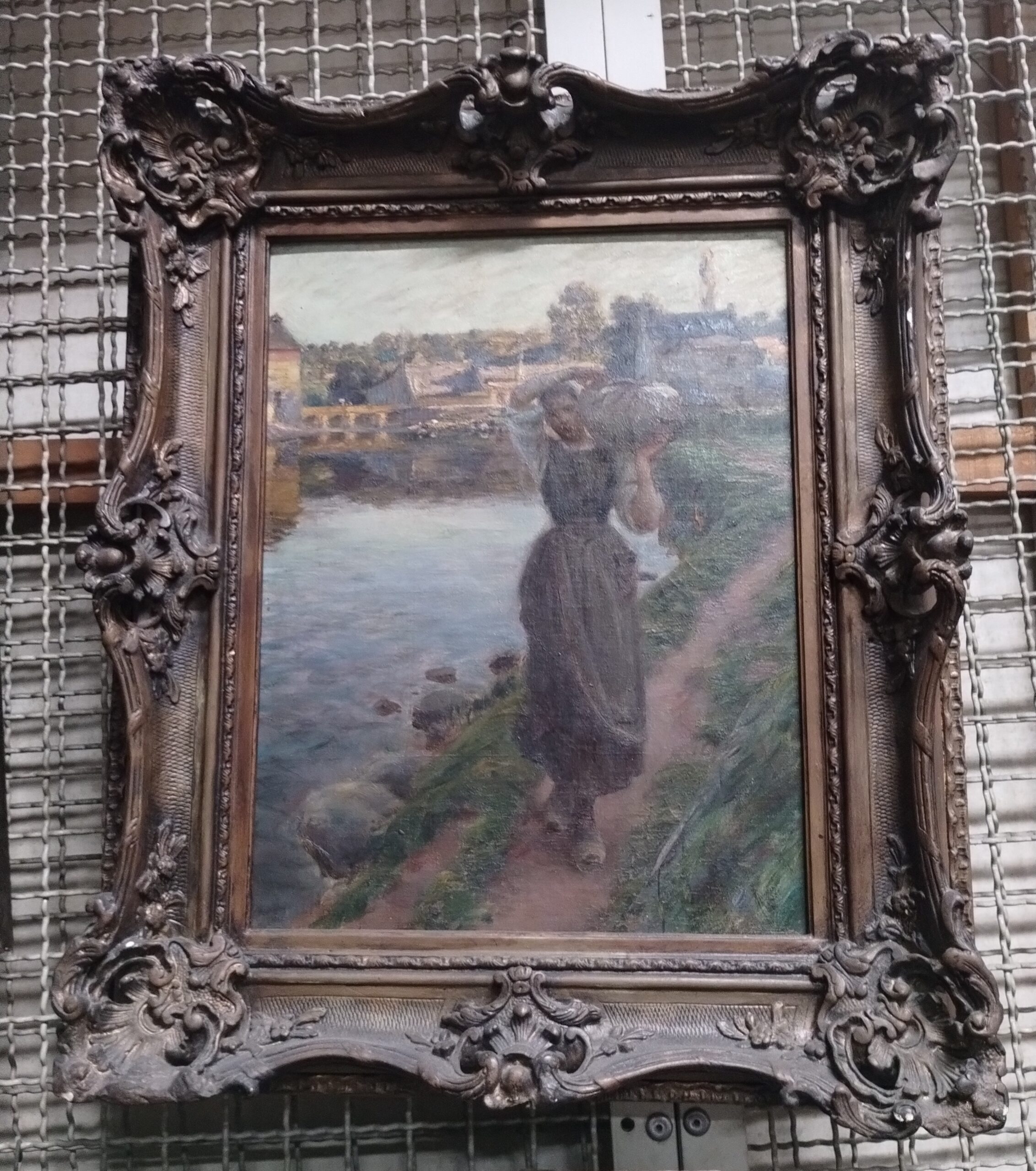 No primeiro plano, moça andando. Cabelos presos sob espécie de touca branca, blusa na mesma cor, corpete, avental e saia em tons pardos escuros. Pé direito à frente, pé esquerdo recuado. Tamancos. Braço direito articulado para o alto, passando sobre cabeça, mão segurando uma trouxa, apoiada sobre ombro e braço esquerdo, À direita, chão e vegetação. À esquerda, rio em tons azuis e lilases e pedras escuras na margem. Ao fundo, ponte, casas, árvores e céu esverdeado. Assinatura do autor no canto inferior esquerdo em tinta marrom: "Souza Pinto". Moldura em madeira estucada dourada, com decoração vazada de penachos, volutas e flores nos ângulos, nos centros das laterais e da parte superior e inferior.