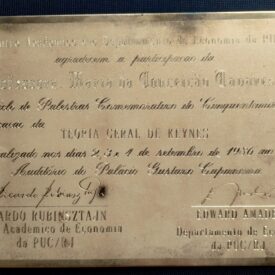 Placa de Homenagem – Centro Acadêmico e Departamento de Economia da PUC-RJ no ciclo de palestras comemorativo do cinquentenário da publicação da Teoria Geral de Keynes, Rio de Janeiro/1986