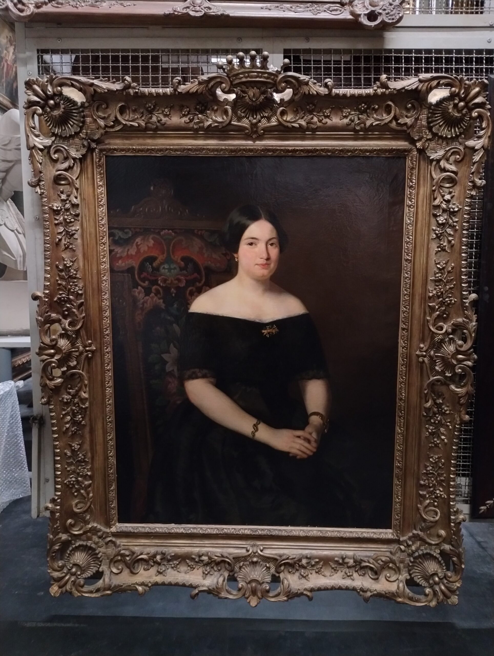 Mulher jovem em meio corpo, sentada, ligeiramente voltada para a direita. Rosto pequeno, oval. Faces coradas, Nariz pequeno. Boca esboçando sorriso. Olhos e sobrancelhas escuros. Cabelos escuros, lisos, partidos ao meio e presos atrás. Lóbulo da orelha direita aparente, com pequeno brinco. Vestido preto, decotado, circundado por pequena renda branca, saia ampla e longa. Braços nus, flexionados à altura da cintura, pousados sobre o colo; mão esquerda sobre a direita. No centro do decote, broche dourado em forma de galho, com pérolas e pedras verdes. Nos pulsos, pulseiras douradas. À esquerda, detalhe de espaldar de cadeira, alto, estofado com tecido de fundo escuro, com flores e folhagens estilizadas na cores vermelha, verde, amarela e rosa. No topo do espaldar, volutas encimadas por vieira. Fundo castanho escuro. Assinatura do autor e datação no canto inferior direito em tinta preta: "Krumholz/1850".