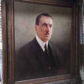 Busto de homem de meia idade, voltado para a direita. Rosto comprido. Cabelos curtos, castanhos. Sobrancelhas ralas, escuras. Olhos castanhos claros, pince-nez branco sobre o nariz curto e grosso. Boca pequena. Bigode curto e escuro. Orelha direita visível. Paletó, colete e gravata escuros. Na parte superior da gravata, pequeno ornato dourado, circular, e, na parte inferior, sobre colete, detalhe de joia dourada. Fundo azeitonado. Assinatura do autor, localização e datação no canto inferior direito em tinta vermelha: "J. Timotheo/Rio. 925". Moldura dourada com concheados e folhagens nos ângulos.