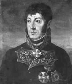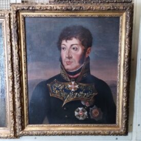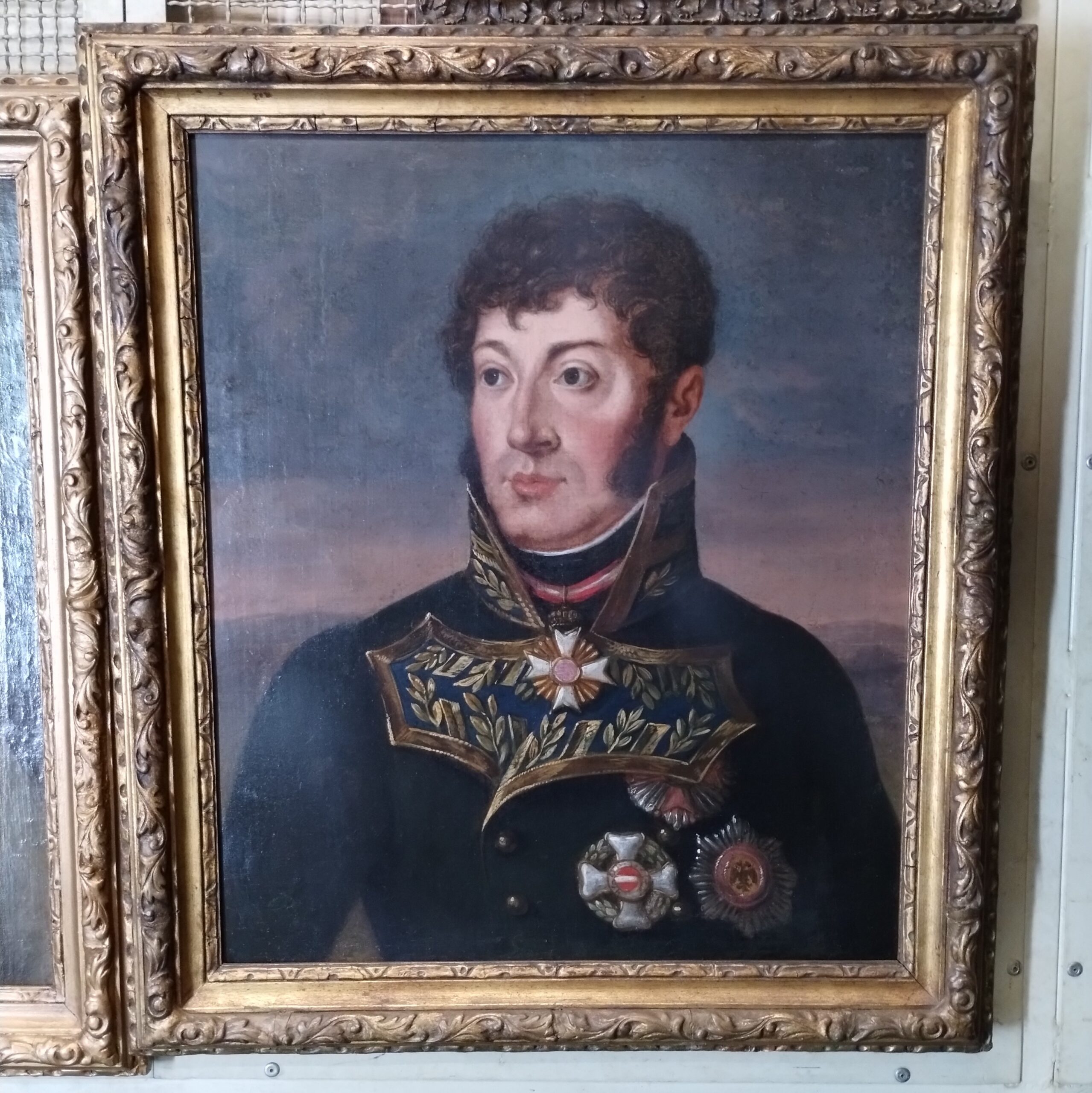 Retrato de busto de homem jovem, voltado para a esquerda. Rosto e nariz compridos e finos. Cabelos curtos, castanhos, encaracolados, sobre testa. Suíças. Sobrancelhas castanhas, finas e curtas. Olhos escuros. Boca pequena. Orelha esquerda aparente. Túnica negra, fechada, de abotoamento duplo. Gola alta, azul, com ornatos dourados, tendo na parte inferior, nas mesmas cores, espécies de lapelas retangulares com extremidades em ponta. Colarinho negro com detalhe branco e, sobre este, fita estreita, vermelha, com filete branco no centro, sustentando insígnia da Ordem de Maria Teresa. Sobre peito esquerdo, em roquete, três comendas, a superior encoberta parcialmente. Fundo constituído de horizonte em tons róseos e azuis. Moldura em madeira dourada, com decoração fitomórfica saliente.