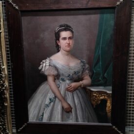 Retrato de Maria Anna Soares Brandão, 3/4 do corpo, trajando vestido branco com guirlanda de flores azuis. Braço esquerdo flexionado em direção à cintura, com cotovelo apoiado em aparador. Braço direito pendente em frente ao corpo. Assinatura do autor no canto inferior direito em tinta vermelha: "E. Viancin". Moldura em madeira lisa envernizada e com apliques de ramos de louro em metal dourado em cada ângulo.