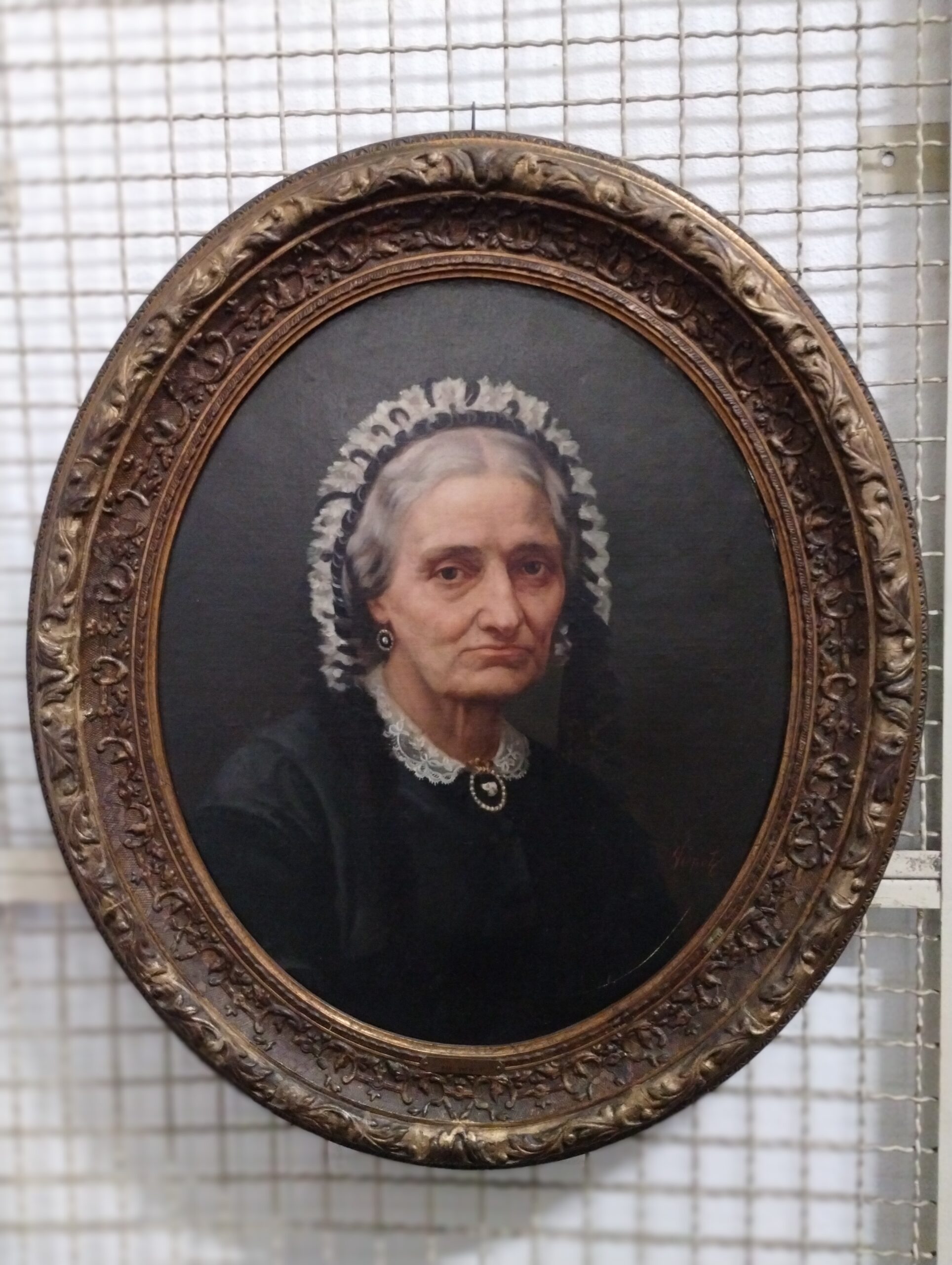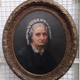 Contra fundo escuro, liso, elíptico, retrato de busto de senhora idosa ligeiramente voltada para a direita. Cabeça semi-encoberta por toucado em renda, com tufos brancos, contornado por friso torcido preto e cinza, terminado em pontas negras. Cabelos brancos acinzentados, partidos ao meio, contornando a face e cobrindo parcialmente a orelha direita, da qual pende um brinco redondo, negro, tendo centro e contornos perolados. Face sulcada por rugas acentuadas até o pescoço. Vestido negro abotoado na frente, gola redonda de renda branca arrematada por broche redondo com cabeça de animal (?) ao centro, contornado por pérolas com acabamento floral dourado. Moldura elíptica em madeira entalhada com motivos florais, segmentada em faixas e frisos côncavos, convexos, dourada.