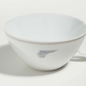 Xícara de chá com pires, em porcelana na cor branca, de forma abaulada, decorada com dois frisos finos nas cores cinza e dourada junto à borda externa. Logomarca da Panair na cor cinza, na parte externa. Pires em porcelana na cor branca decorado com dois frisos finos nas cores cinza e dourada junto à borda. Inscrições na base da xícara e no fundo do pires: "Rosenthal - Germany".