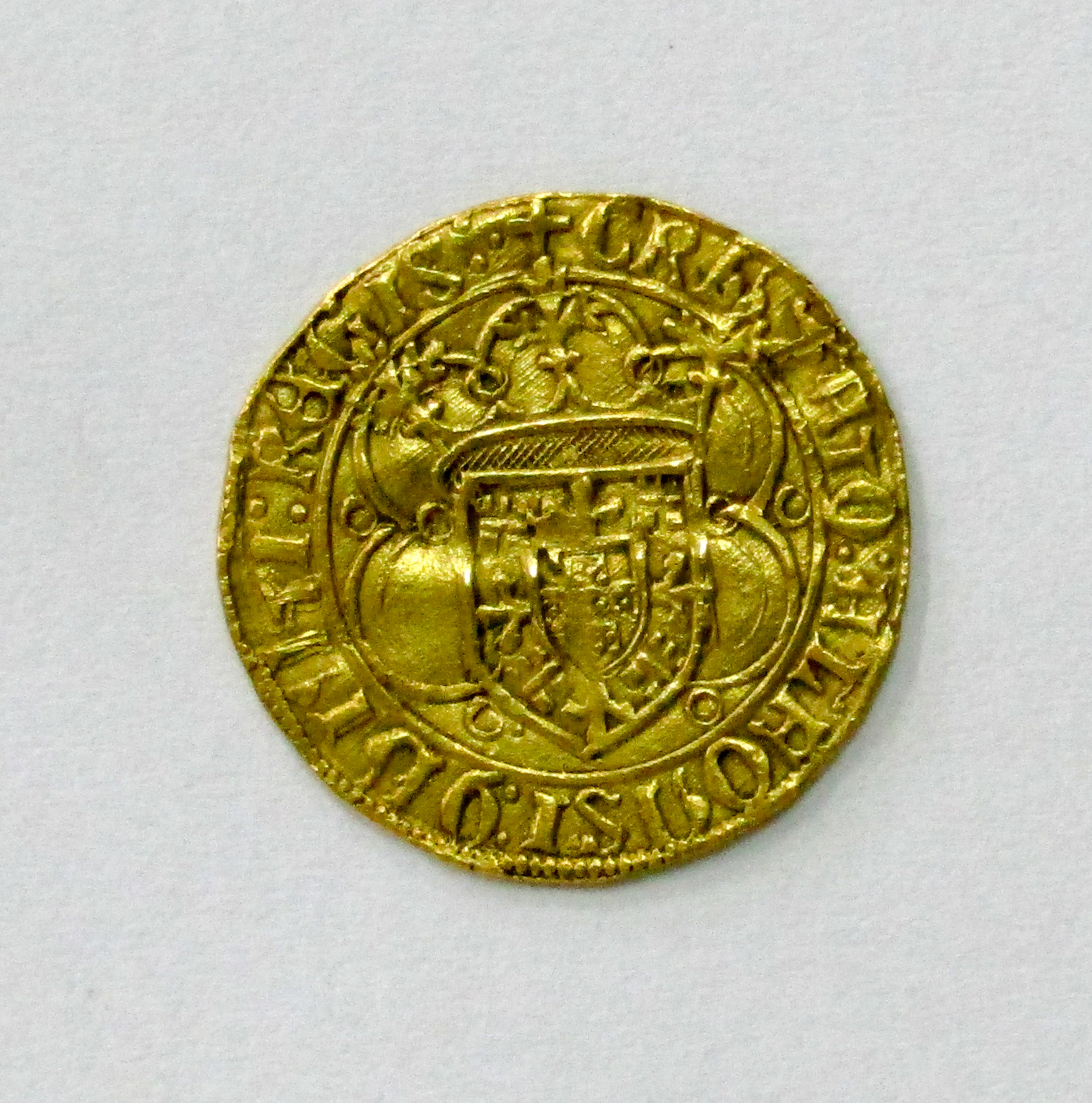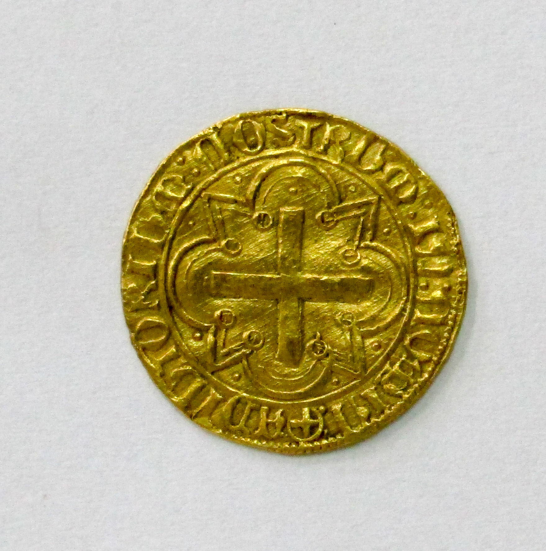Anverso: Ao centro, o escudo das quinas, assente sobre a cruz de Avis, entre quatro castelos, tendo, por cima, a coroa real, dentro de arcos duplos. Legenda + CRVZATVS: ALFOÁSI.QUIÈTI: REGIS. Reverso: Ao centro, a cruz de São Jorge(a cheio), dentro de um círculo gótico duplo unido por aneis. Legenda: + ADIVTORIVM : NOSTRV : IN : NOMIN.